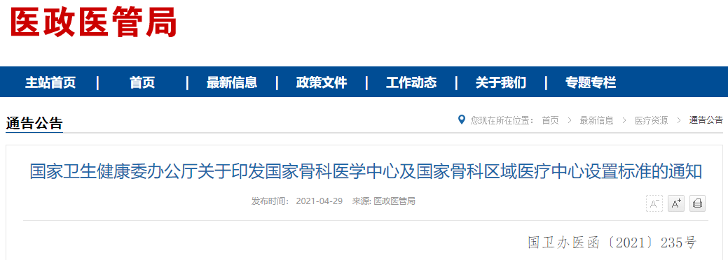 2021年4月29日,国家卫健委医政医管局新发布了一则《关于印发国家骨科医学中心及国家骨科区域医疗中心设置标准的通知》,标准中,除了对于骨科医学中心的硬件要求之外,更是对所需的医疗设备标准进行了公布。
