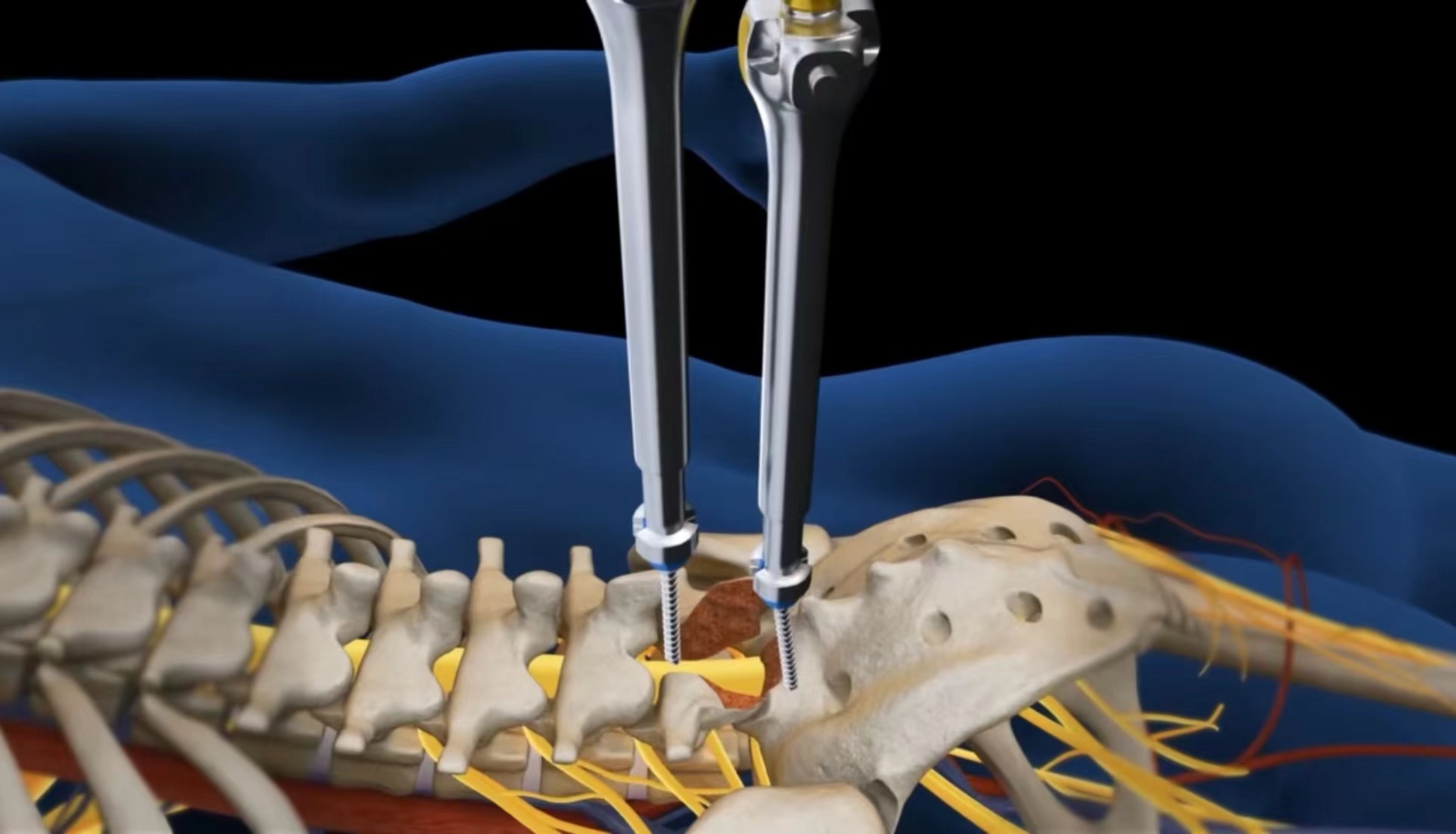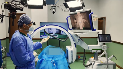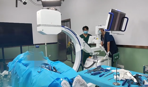 切口和术野显露,在腰的后面作约8-10公分的切口。使用普爱大平板一体式C形臂来精确定位将要实施手术的脊柱部位。