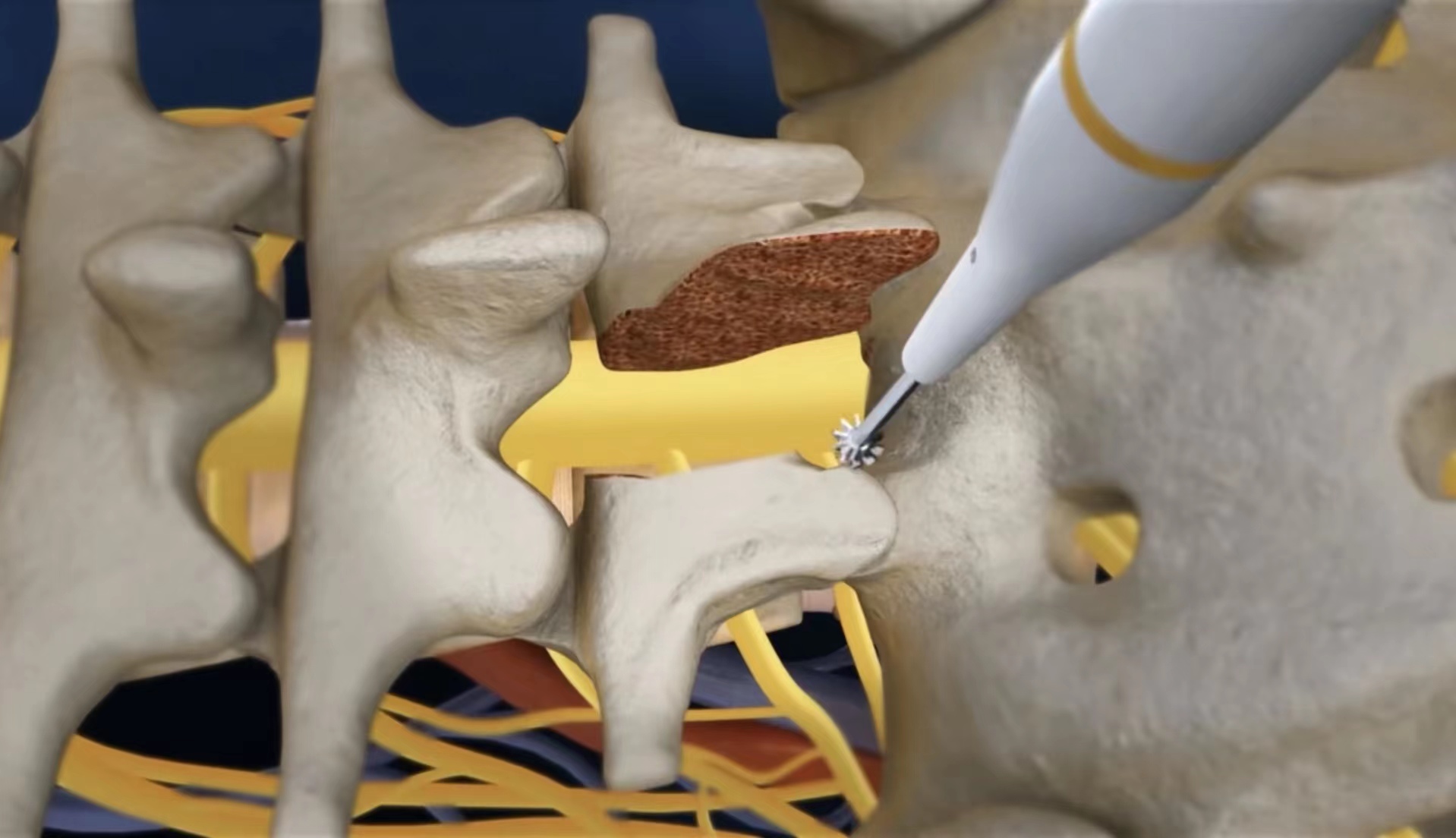 小心移除椎弓板(椎板),这样才能够看到和进入神经根部??啥陨窬可厦娴男」亟诮行拚匀贸龈嗫占涓窬?。外科医生然后清除受累椎间盘及其周围组织,并在相邻椎骨表面为椎体融合做些准备。